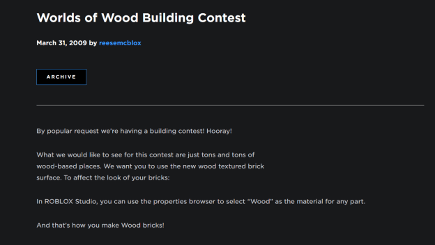 March 31st, 2009 is a date not many people will remember, but it is a date which set forth a series of events that would entirely shape my life for the last 5 years. Was it some major geopolitical event? Family event? Dark personal tragedy? No, it was none of the above. You see, March 31st, 2009 was the day that Roblox officially announced they were adding wood to the game. But like most events that will be referenced in this post, the date wasn’t the true first time I saw wood grain on Roblox, as I was active on Roblox’s test servers then and likely saw it a week or so early.