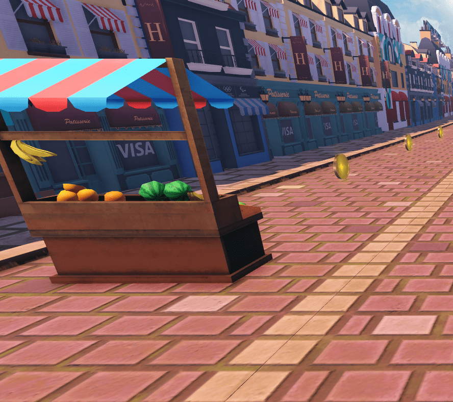 Next up it is time to move outside of the main lobby for Olympic World presented by Visa, first with the infinite runner mini-game. It is a bit hard to see because the texture is a bit faded and due to the nature of the game it was difficult to get a decent screenshot, but the sides of the vertical post have horizontal wood grain instead of vertical wood grain. As this fruit stand clearly looks as if it has a UV mesh, this should be a fairly easy and quick fix to make.
