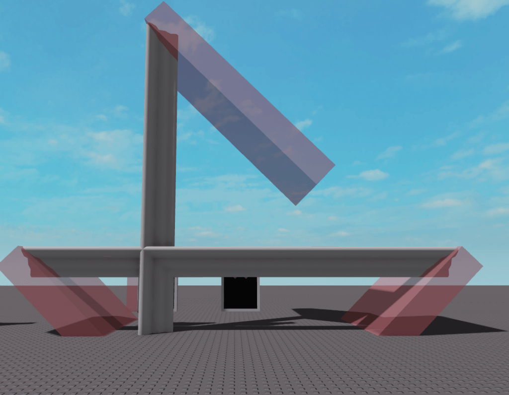 One important thing to note is that I am using Studio Build Suite to do this, which has the ability to resize multiple bricks at the same time along the same axis at the same time. It also has another ability which is to pivot bricks along an edge, which I use in this case to to rotate a brick in at 45 degrees.