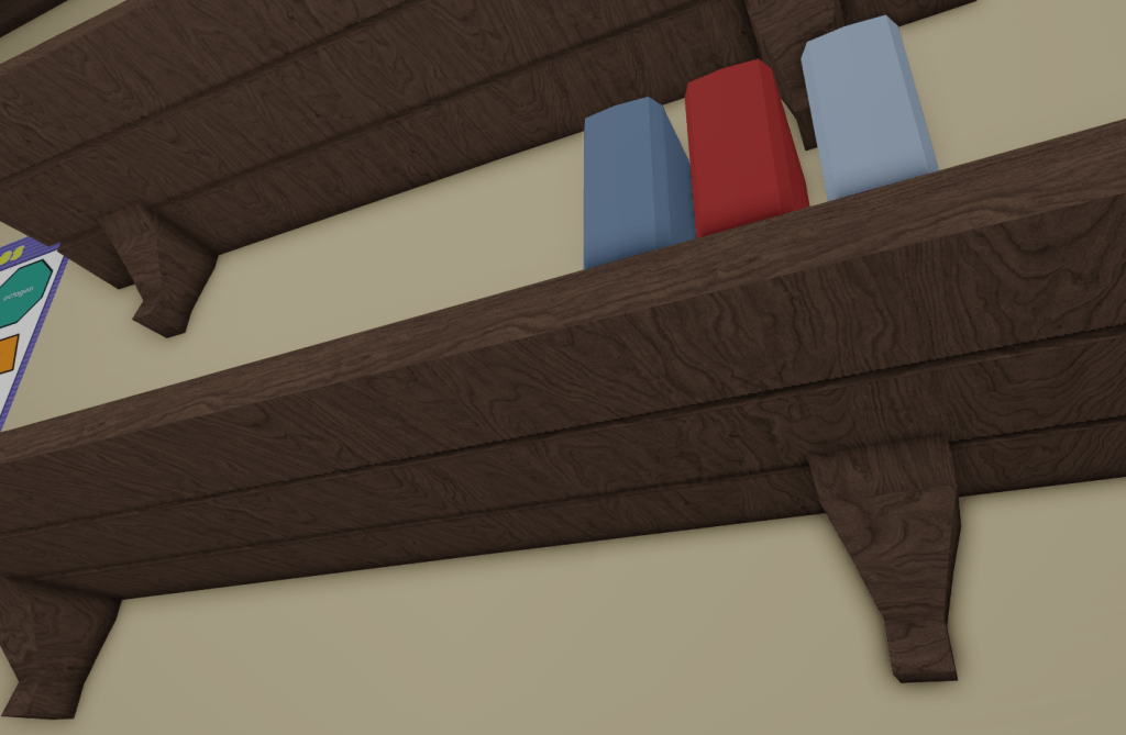 Another school escape obby, this was was unique because it was in first person, which is at least unique for about the next 10 or so games in this review. What isn’t unique is the wood grain here, with these shelves having bad wood grain along with several other examples not shown here.