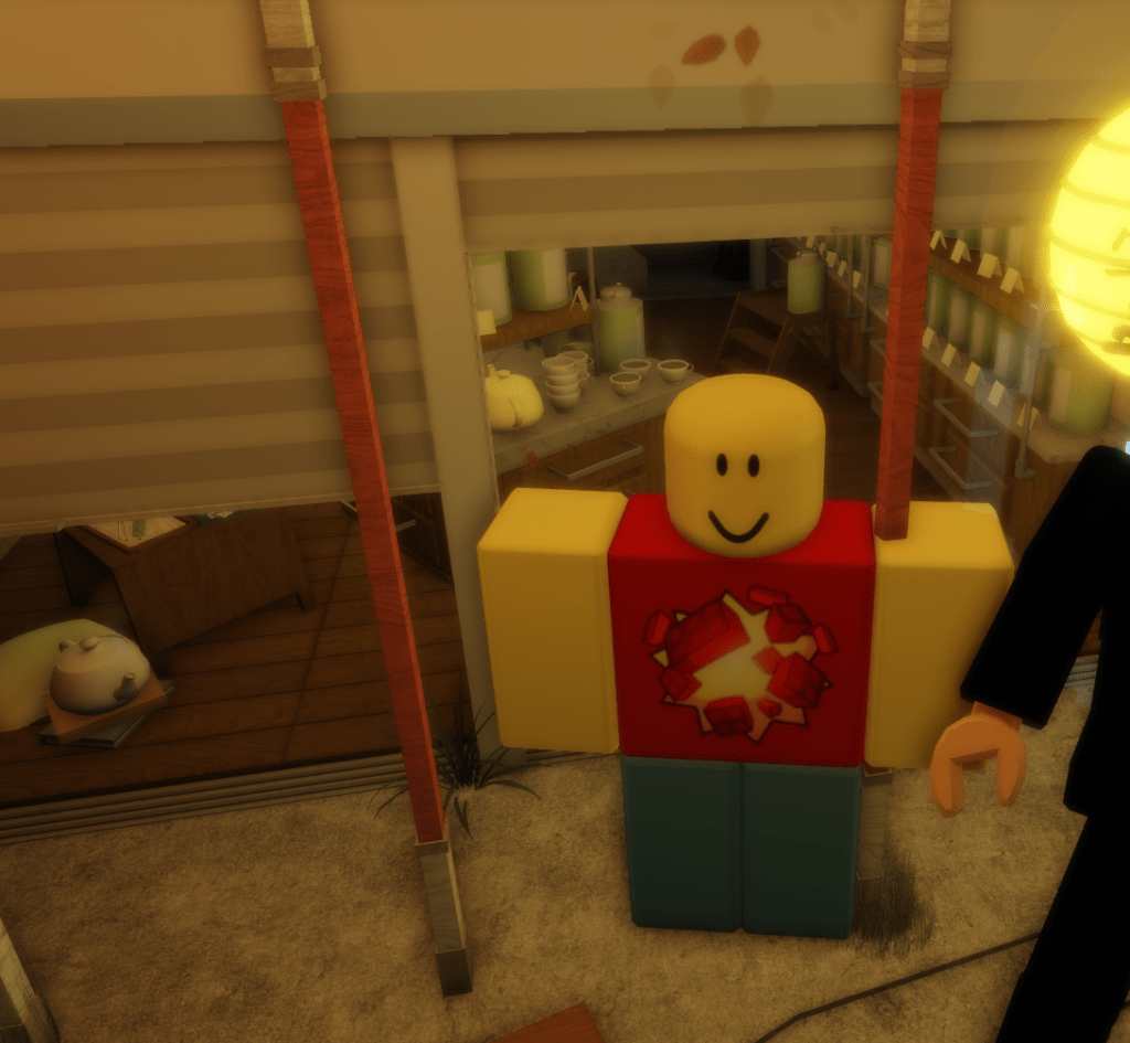 Moving inside of the little shop stall thing behind the doors you would hope that the wood grain would improve. But it doesn’t. The walls behind me have bad wood grain on the vertical framing, while the vertical boards to the right also have bad wood grain. Additionally, the wood grain on the tables in front of me are also bad.