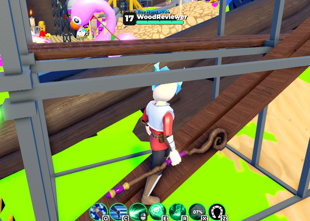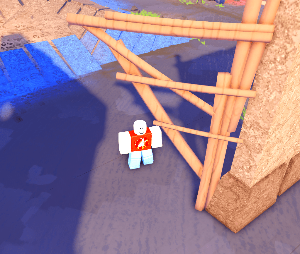 No, I have no idea why World//Zero, Pressure, and Build a Golem Army are grouped together either. But that doesn’t really matter; what does matter is that this little scaffolding area near the spawn in the special event area for World//Zero has bad wood grain on the diagonal planks in the normal default Roblox wood texture, unlike the regular game which has a weird wooden texture that some people debate me on due to it being different.